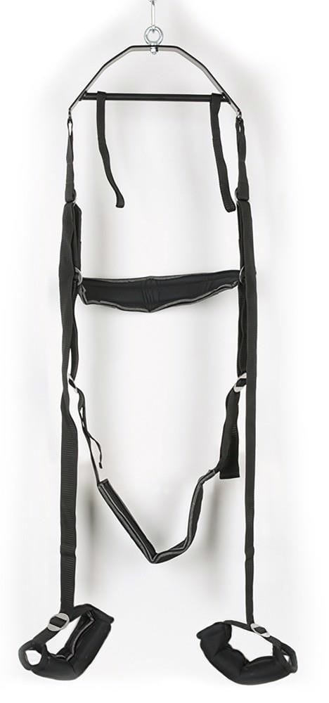 This swing makes positions that are “physically” impossible in bed a real pleasure. He can gently guide the swing so that she swings almost weightlessly in the air or he can sit in the swing and she sits on his lap. With supporting structure and assembly construction (crossbar - 38 cm wide). The straps and loops (for hands and feet) are made out of padded, tearproof nylon and the length of the straps can be adjusted. Black. Max. weight 100 kg. Includes a flogger (38 cm long) with 8 tails and a leather handle, blindfold and mounting accessories. Material: metal, polyester, split leather, polyamide.