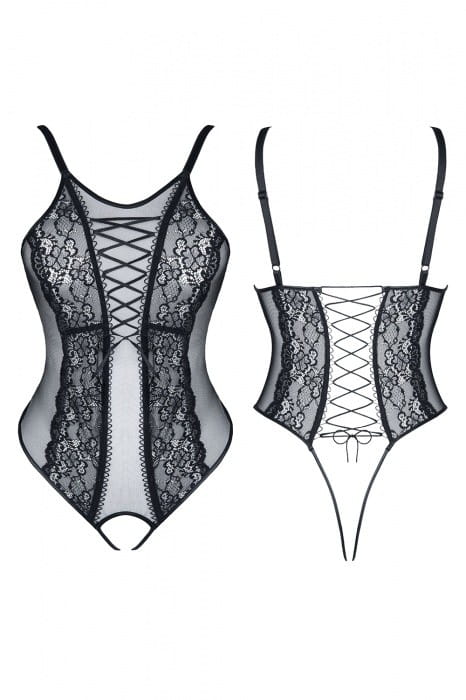 Body wykonane z czarnej, miłej w dotyku siateczki oraz eleganckiej, równie miłej w dotyku koronki. Misterne kompozycje z koronki łączą się z czarną siateczką, tworząc z przodu ciekawą kompozycję o podłużnym kształcie. Dzięki temu body optycznie wyszczupla sylwetkę. W górnej części sznurowanie wykonane z czarnej tasiemki ozdabia okolicę dekoltu.