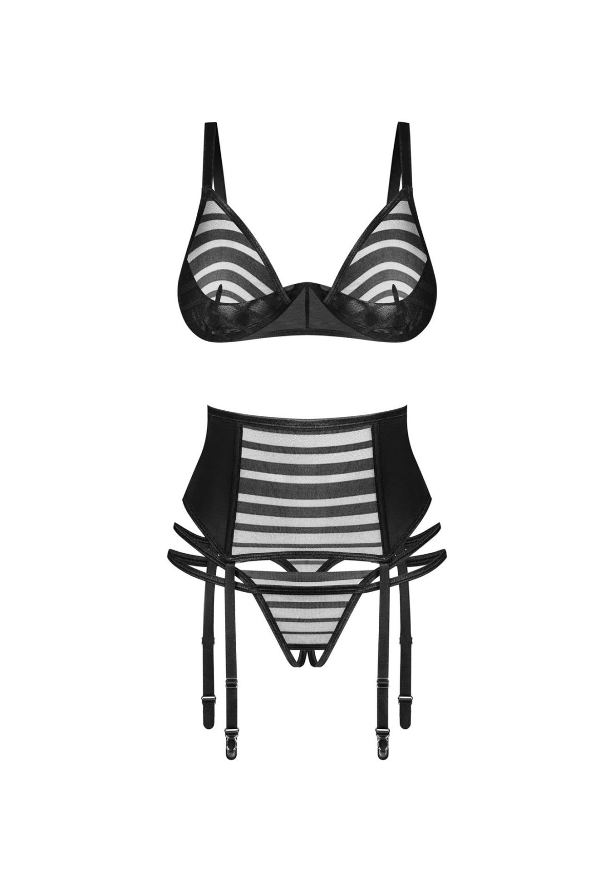 Zmysłowy komplet transparentnej bielizny w paski, który przyciąga uwagę i podkreśla kobiece kształty.