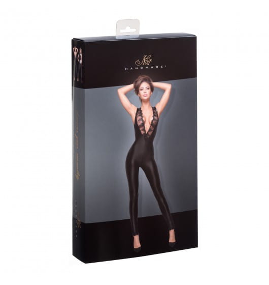 Ekskluzywny kombinezon na ramiączkach powerwetlook z dwustronnym zamkiem w kroku i dodatkowym zamkiem z tyłu. Wspaniały głęboki dekolt wykończony haftowaną koronką.