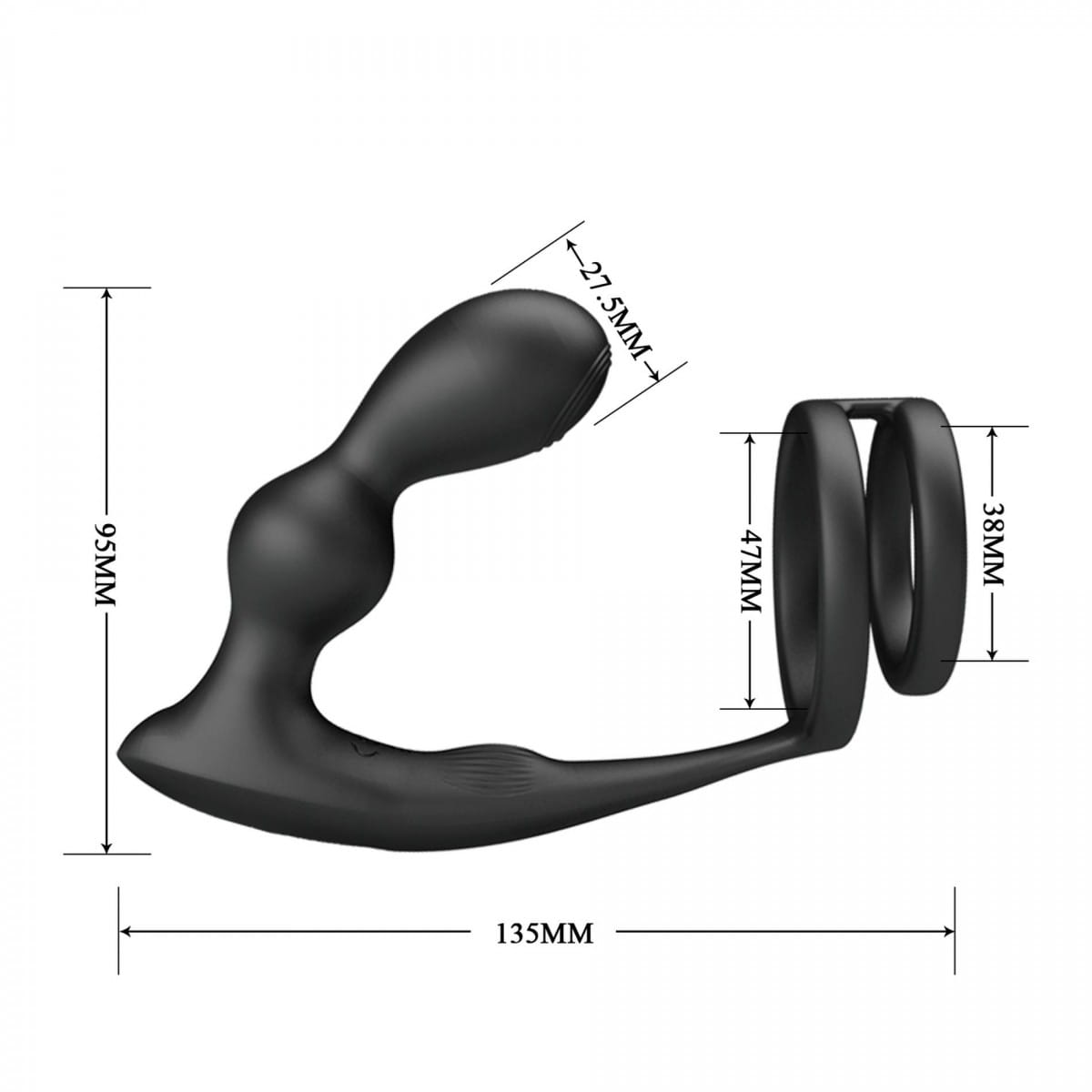 This cock ring with remote control butt plug is a combined cock/ball ring with a securely attached vibro-butt plug. The plug can be easily controlled via the remote control. The combined rings hold the penis and testicles securely and can support the erection effectively because of the blood congestion effect. The inserted vibro-butt plug with its special ball design and 12 different vibration modes can provide intense backdoor stimulation. It is covered in silicone that has a soft touch texture which feels great against the skin. Makes the penis strong and pleasures his backdoor at the same time! It can be recharged with the included USB cable and the remote control is powered by a AAA battery.