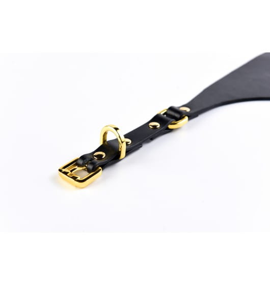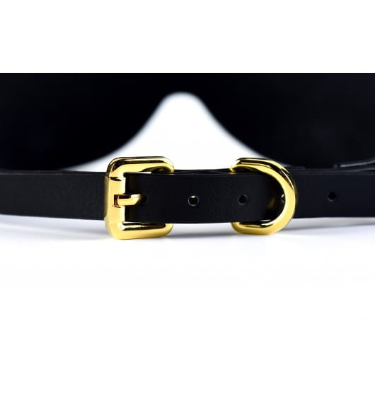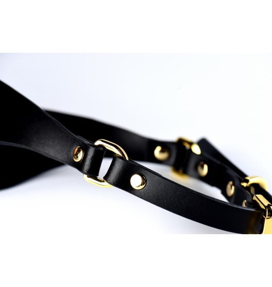 Czysta skóra pokrywająca obie strony opaski na oczy zapewnia wygodne i gładkie noszenie. Połączenie części metalowych jest tym, co czyni produkt wyjątkowym. Czerń skóry doskonale komponuje się ze złotymi elementami ze stopu cynku, dodając poczucia elegancji i luksusu.