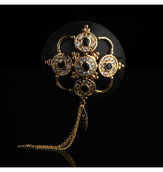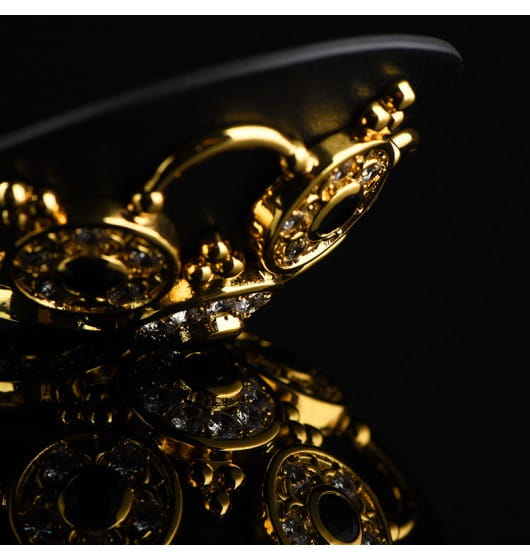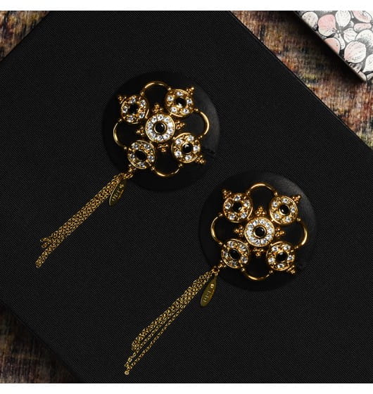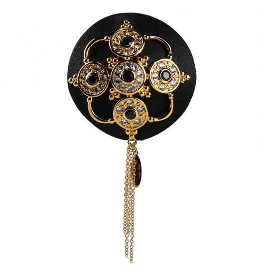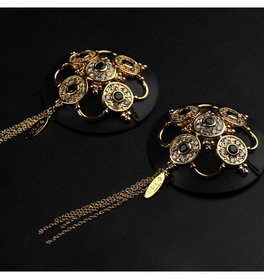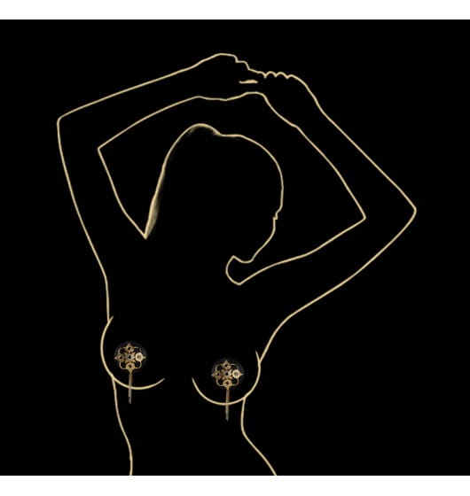 Luxury Baroque Leather Pasties marki UPKO to luksusowe nasutniki w barokowym stylu. Bogato zdobione, wykonane z bydlęcej skóry osłonki na sutki zostały udekorowane ażurowym wzorem w kolorze złotym, na którym dodatkowo umieszczono 10 czeskich klejnotów oraz 60 cyrkonii. Zwisające łańcuszki dodają uroku, sprawiając, że nasutniki nie są tylko gadżetem w sypialni, stają się również piękną biżuterią.