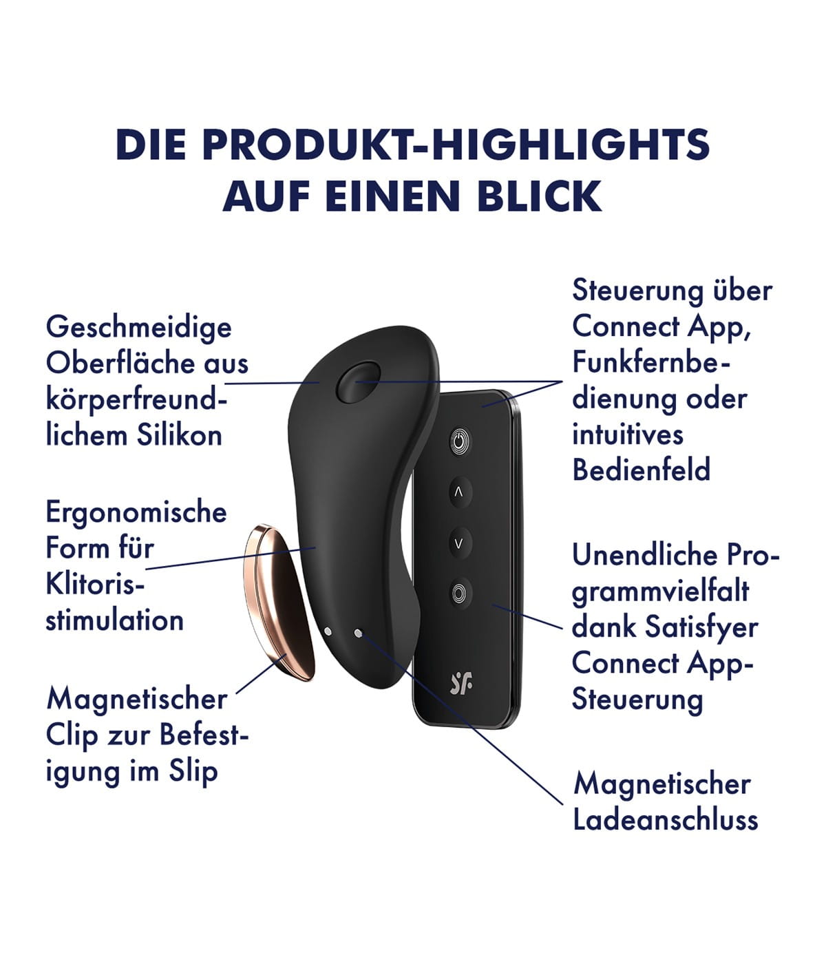 Satisfyer Little Secret można kontrolować zarówno za pomocą dołączonego pilota radiowego, jak i bezpłatnej aplikacji Satisfyer Connect, która jest dostępna zarówno dla urządzeń Apple, jak i Android. Możesz więc dyskretnie używać Little Secret w codziennym życiu lub przekazać kontrolę swojej ukochanej. Dzięki aplikacji Satisfyer Connect możesz także odkrywać nowe sfery przyjemności: twórz własne programy wibracyjne w oparciu o hałas otoczenia lub ulubioną listę odtwarzania.